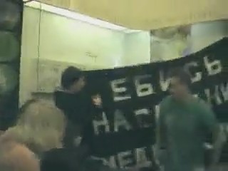 Арт-группа "Война" устроила перфоманс на тему президентских выборов, показав своим выступлением, что происходит со страной. Несколько молодых пар занялись сексом в одном из залов московского биологического музея, как бы говоря, что всех нас "поставили раком" - впрочем, ребята угадали. Вам же, дорогие зрители, предлагаем насладиться групповым порно - молодые люди под громкие звуки колокола отъебали своих симпатичных подружек и все на камеру сняли.