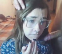 Девушка "на любителя" удовлетворяет любовника на потеху развратной публике. Мастерски миловидная особа наяривает длинный хуец, абсолютно не помогая себе руками. Очкастая телочка с обнаженной большой грудью достаточно быстро справилась с такой легкой задачей, как доведение до оргазма, и вскоре потоки семенной жидкости устремились на личико, забрызгав даже очки - но это девушку не только не смутило, но и очень ей понравилось.