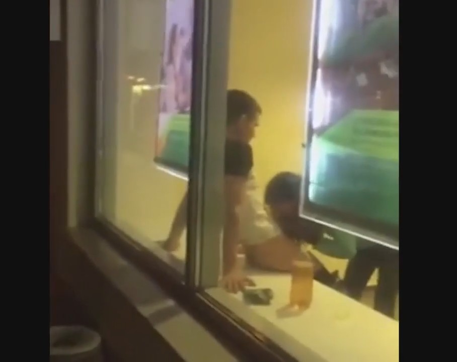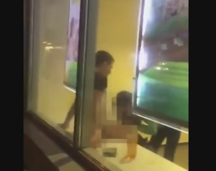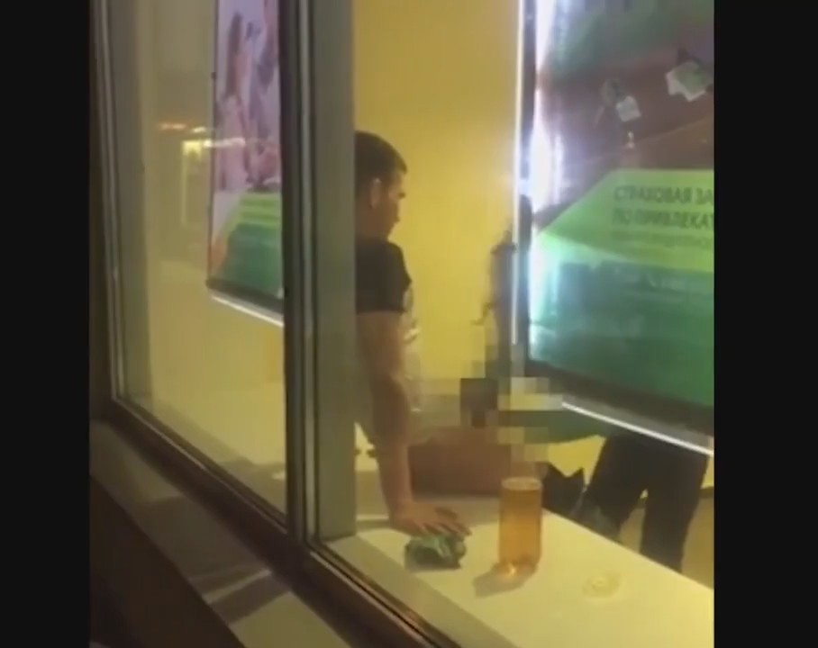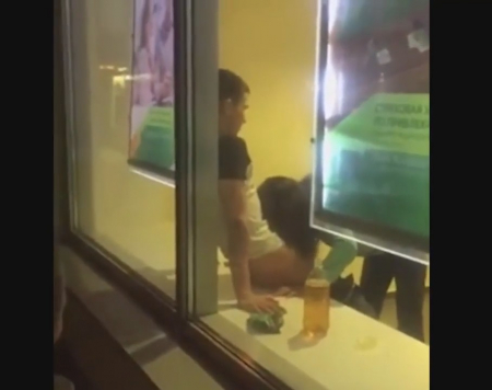 Может ради остроты ощущений, а может просто нашли теплое местечко, но развратная парочка удивила многих прохожих в тот день. Такого еще не бывало! Дело в том, что любовнички укрылись в помещении сбербанка возле большущего окна, выходящего на тротуар. Молодой человек уселся на широкий подоконник и, сняв штаны, наслаждался глубоким минетом, который так вежливо сделала ему стройная подруга.