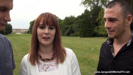 Теплым летним днем двое парней, прогуливаясь в парке, сняли рыжеволосую молодую француженку. Парни увели девушку в укромное местечко в парке и трахнули симпатягу в чулках прямо на траве. Сначала куколка сосала одному, а второй ее ебал. А после парни отымели телку в два члена сразу.