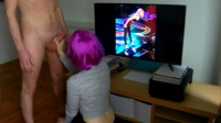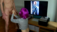 Кажется эта розововолосая девчонка нашла способ разнообразить семейную жизнь в паре. Основная сложность заключается в том, чтобы при этом подавить в себе эгоизм и чувство собственности. И речь идет вовсе не о сексе втроем. Зная, что парень обожает некоторых актрис из фильмов, она включила слайдшоу с их фотографиями на телевизоре и стала надрачивать своему молодому человеку, добиваясь эффекта, как будто ему мастурбируют звезды с экрана, а не она. Дойдя до момента, когда парень уже был близок к кульминации, она взяла член в рот и завершила начатое.