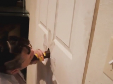 Сосет через дырку в двери
