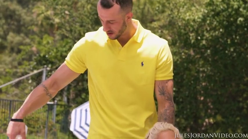 Когда в бассейне купается элитная шлюха с большими бидонами и жопой, ее можно облить маслом и ебать во все дыры, ибо вряд ли она годна для глубоких душевных разговоров. Да и не для этого мужик в шортах туда шел - увидев ее пятый размер бидонов и жопу, глупые мысли уходят из головы сами собой, оставляя лишь одну - нужно трахнуть сучку. Он обливает ее маслом, после чего начинает трахать промеж грудей таким образом, чтобы головка точно попадала ей в рот. После такого специфичного минета он ловко довел суку до оргазма вагинальным сексом и живо переключился на долбежку в задницу.