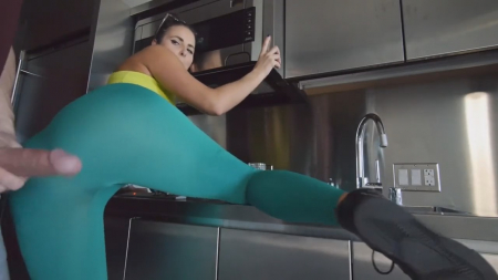 Что может быть лучше с утра, чем сексуально выглядящая девушка, готовящая тебе завтрак на кухню. И ты должен будешь сделать все, чтобы ее яичница на сковородке справедливо подгорела. Брюнетка вряд ли специально одела на себя тоненькие голубые лосины без трусиков, но это не помешало ее любимому засранцу подойти к ней сзади и начать возить своим членом по киске через одежду, то и дело почти доходя до состояния, чтобы порвать ее штаны и войти внутрь. Это было настолько возбуждающе, что чувак прямо взял и обкончал бедные лосины, пока их обладательница соблазняюще вертела попкой.