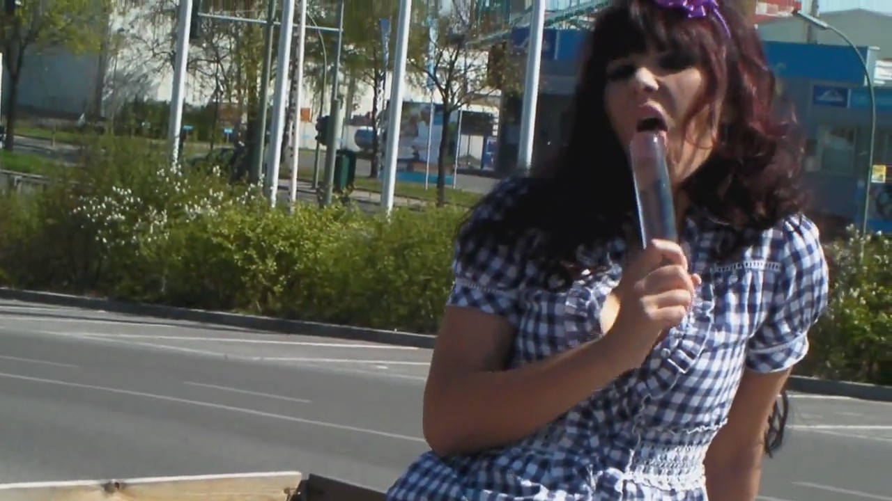 Моральные нормы - чересчур расплывчатая штука. Кому-то тяжело попросить незнакомого человека помочь, кто-то может смеяться над инвалидами, а есть эта брюнетка. И ей абсолютно нормально присесть в клумбу на оживленной и проходной улице, а затем начать мастурбировать. И не просто рукой, а большим прозрачным фаллоимитатором. От приступа адреналина организм девчонки ловил дичайшие оргазмы, а ее лицо принимало совершенно разные выражения. Как бы то ни было, в итоге она обсосала еще раз дилдо, и помчалась дальше по своим делам.